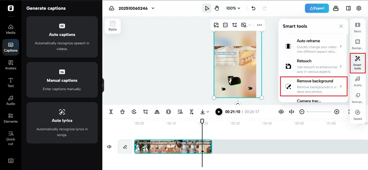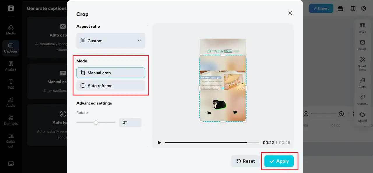Choose Smart Tools, and select Auto Reframe from the dropdown menu. Adjust the Aspect Ratio, select Manual Crop or Auto Reframe, and then apply the video clip to your desired size and remove the watermark, font, or caption.