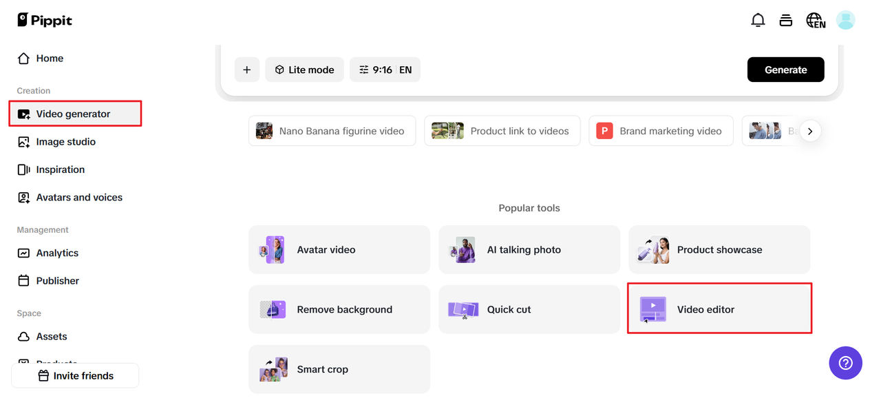 To delete text from video, register in Pippit with your Google, TikTok, or Facebook account and select Video Generator or Smart Tools in the left menu. Select Video editor, drag & drop your video, or select Click to Upload and import the file from your computer.