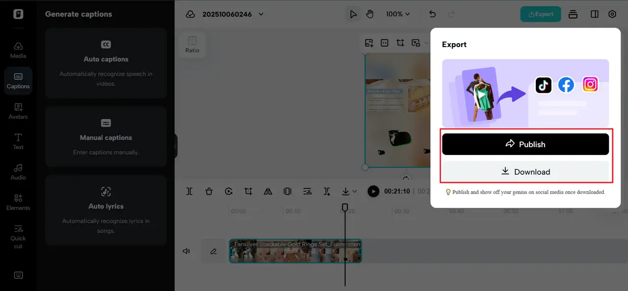 Click Export (top-right) and select Publish or Download. Configure the export settings and click Export again to save the video onto your PC or share it to social channels.